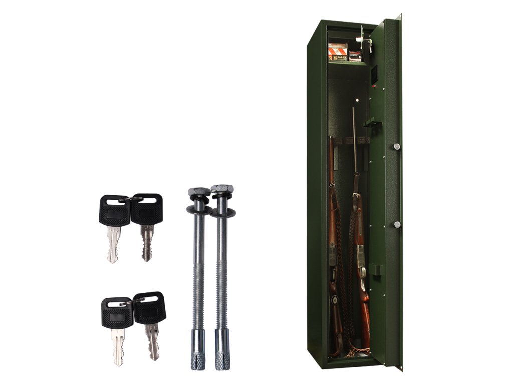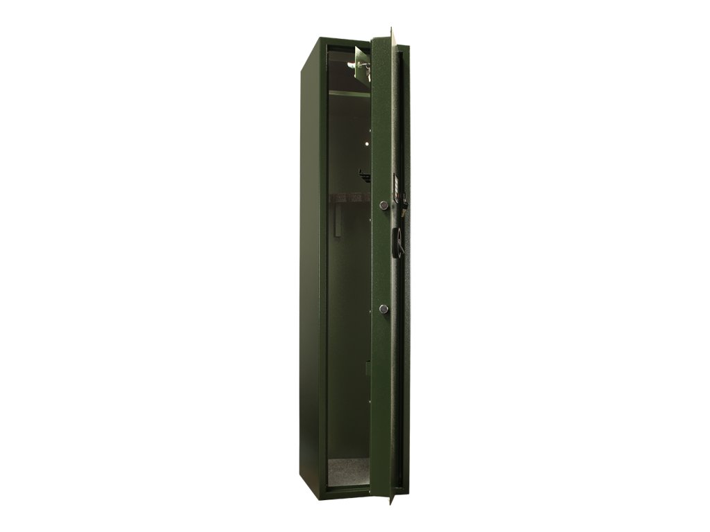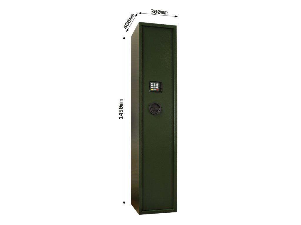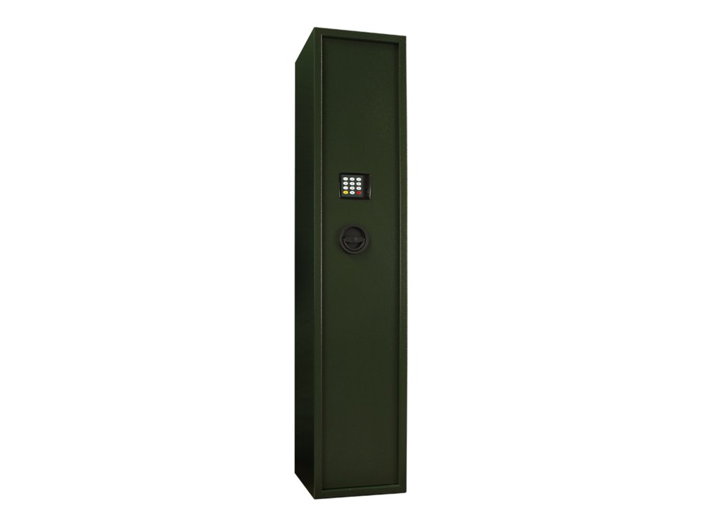 Hlavní výhody: Elektronický zámek s 2 klíči Vhodná pro 5 dlouhých zbraní Napájení 4 x 1,5V AA baterií (není součástí balení) Jednoplášťová skříň Dveřní plášť tloušťky 3 mm a korpus hrubý 2 mm Držák na dveřích pro nářadí na čištění zbraní Vnitřní schránka s cylindrickým zámkem a 2 klíči Mechanické nouzové otevírání s cylindrickým zámkem a 2 klíči Otvory na ukotvení na spodní i zadní části skříně Zelená skříň na zbraně se spolehlivým elektronickým zámkem a 2 nouzovými klíči pro otevření v případě vybití baterií. Jinak je zámek napájen 1,5V AA bateriemi a uvnitř je dostatek prostoru pro 5 dlouhých zbraní. Skříň je vyrobena z kvalitního ocelového plechu tloušťky 3 mm a na vnitřní straně dveří najdete praktický držák, do kterého můžete uschovat nářadí na čištění zbraní. V horní části se nachází samostatně uzamykatelná vnitřní schránka např. pro munici. Skříň na zbraně upevníte na podlahu nebo o zeď přes předpřipravené otvory pro upevnění. Kotvící materiál je součástí dodávky. Tato skříň není certifikována. Pro tuto schránku na zbraně je stanoveno, že při přechovávání dlouhých zbraní do počtu 2 ks nebo do 500 ks nábojů plati prohlášení o shodě.Doplňkové parametry